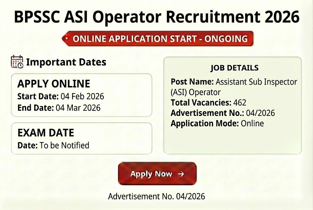 The Bihar Police Subordinate Services Commission (BPSSC) has officially released the notification for the recruitment of Assistant Sub Inspector (ASI) Operator posts. As per the notification, the online application process has started from 04 February 2026, and eligible candidates can apply till 04 March 2026 through the official website bpssc.bihar.gov.in.