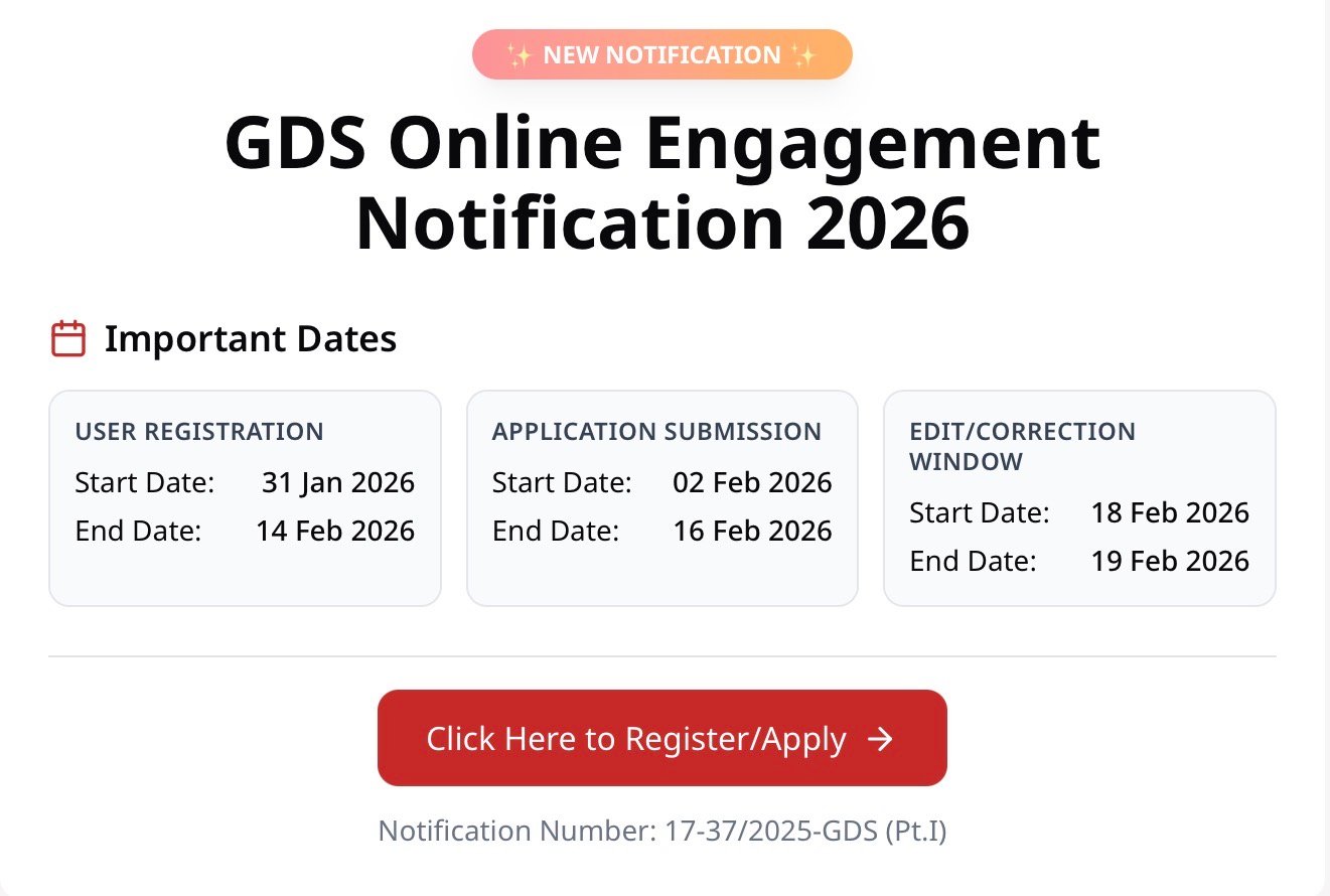 The India Post GDS Online Application Form 2026 has started from 31 January 2026, and eligible candidates can submit their applications till 14 February 2026.