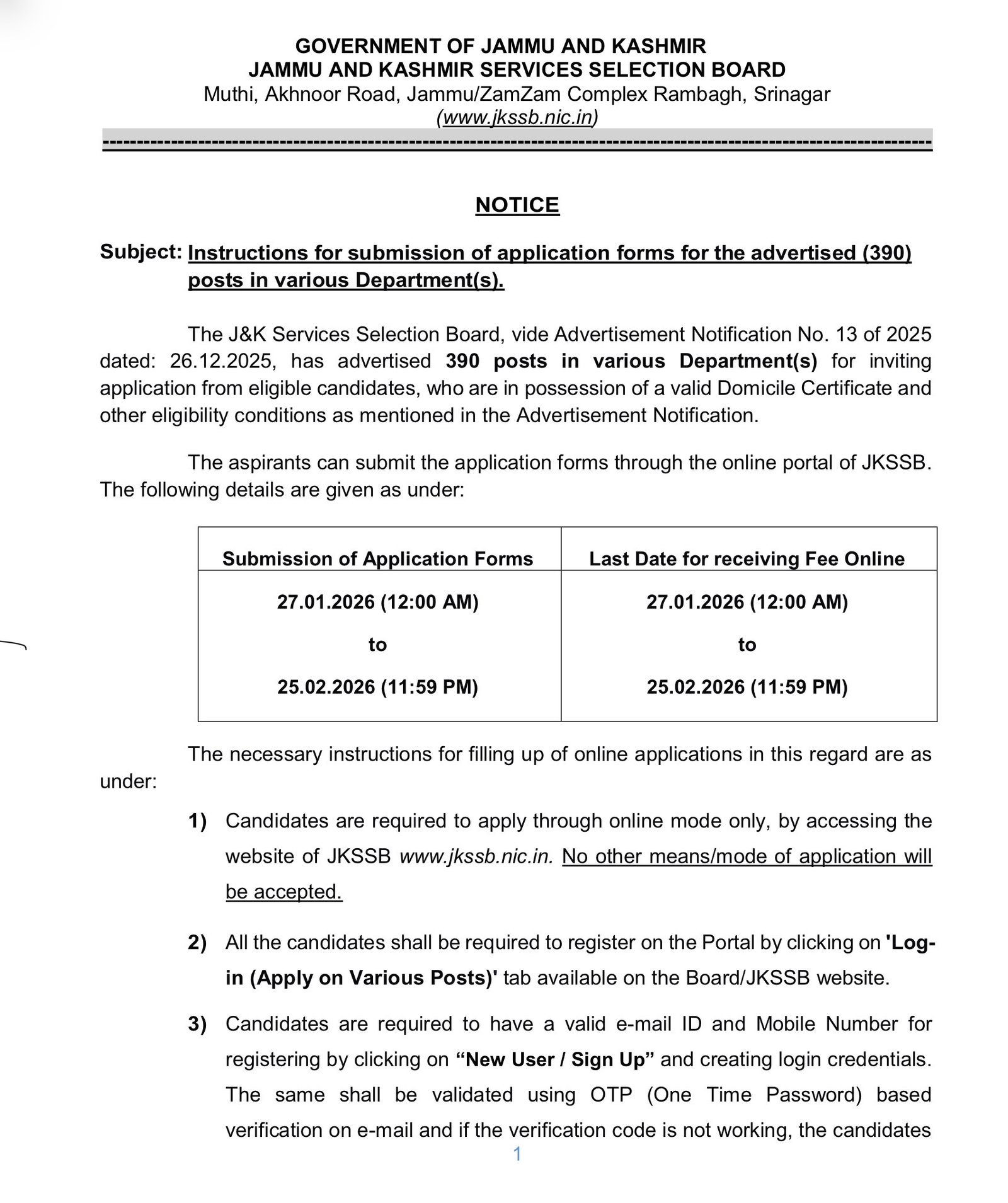 The Jammu and Kashmir Services Selection Board (JKSSB) has issued an official notice regarding the submission of online application forms for 390 posts advertised under Advertisement No. 13 of 2025. Eligible candidates possessing a valid J&K domicile certificate can apply online from 27 January 2026 to 25 February 2026 through the official JKSSB website.