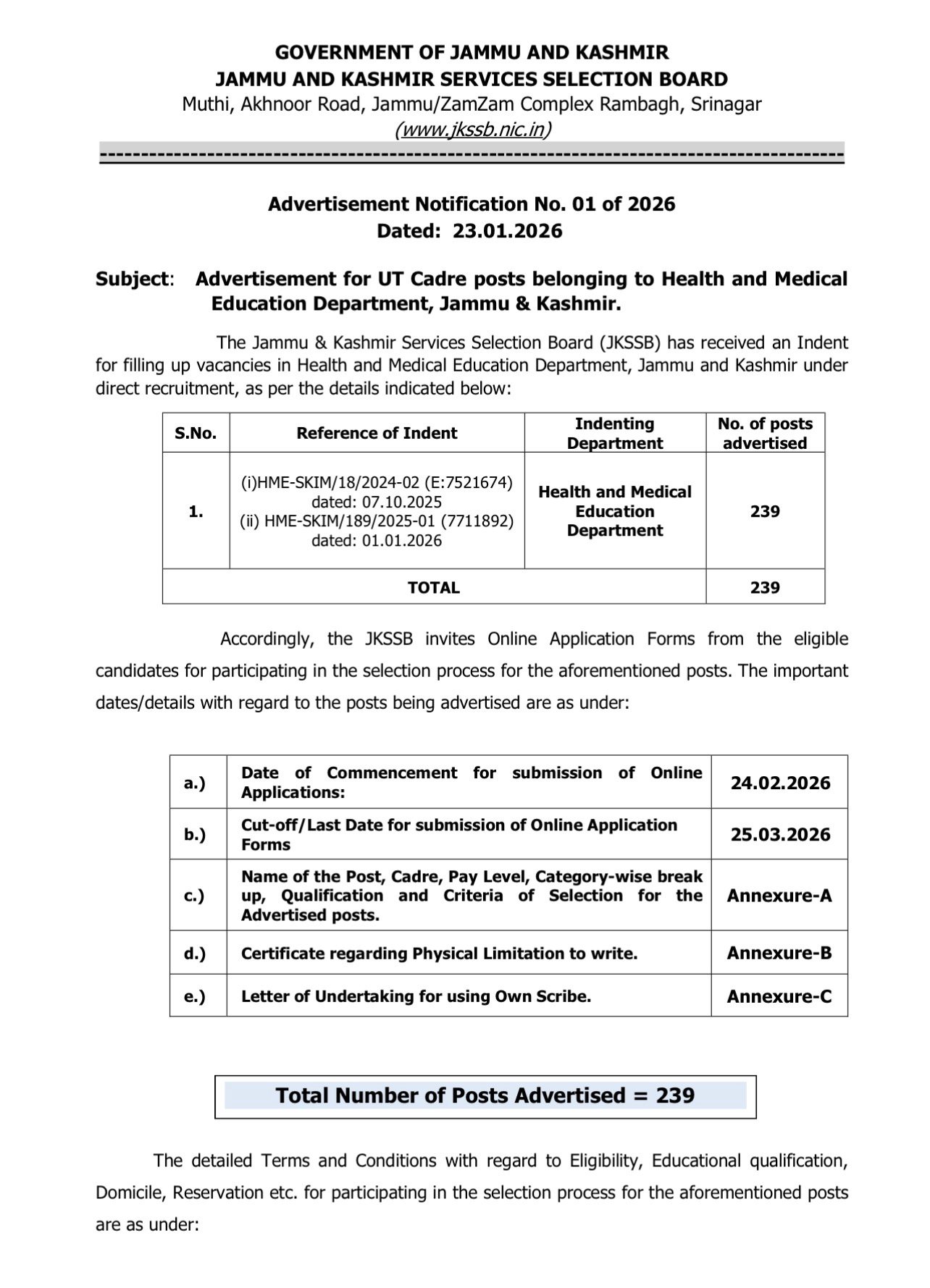 The Jammu and Kashmir Services Selection Board (JKSSB) has officially released Advertisement Notification No. 01 of 2026 on 23 January 2026, announcing 239 UT Cadre vacancies in the Health and Medical Education Department, Jammu & Kashmir. Eligible candidates are invited to apply online within the prescribed timeline.
