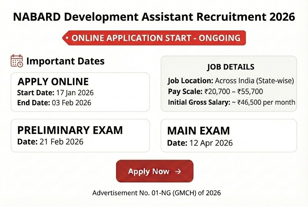 The online application process is open from 17 January 2026 to 03 February 2026 on the official website nabard.org. This recruitment offers a stable central government banking job with an initial gross salary of around ₹46,500 per month.