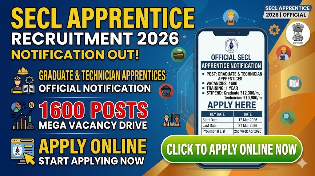SECL Apprentice Recruitment 2026: The South Eastern Coalfields Limited (SECL), a subsidiary of Coal India Limited, has released the official notification for SECL Apprentice Recruitment 2026. A total of 1600 vacancies have been announced for Graduate Apprentices and Technician Apprentices under the Apprentices Act, 1961.